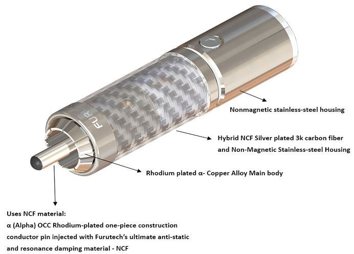 • Alpha OCC Rhodium-plated one-piece construction conductor pin injected with Furutech’s ultimate anti-static and resonance damping material – NCF