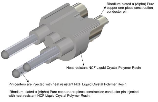 • Rhodium-plated α (Alpha) Pure copper one-piece construction conductor pin injected with heat resistant NCF Liquid Crystal Polymer Resin.