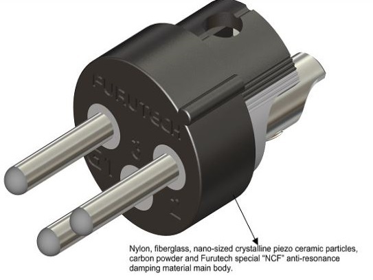 • Nylon, fiberglass, nano-sized crystalline piezo ceramic particles, carbon powder and Furutech special “NCF” anti-resonance damping material main body combine heat resistant NCF Liquid Crystal Polymer Resin. NCF delivers improvements in the depth and focus of the sound stage, harmonics and tonal balance. Low frequencies are cleaner, with a greater sense of definition made possible by a lowered noise floor.