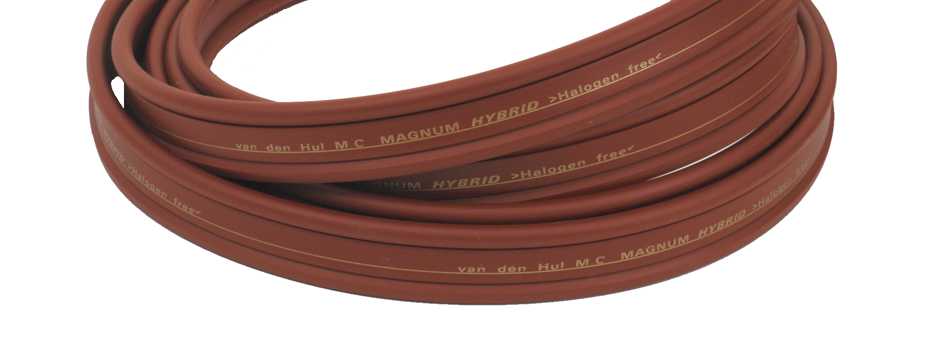 De Van den Hul The Magnum Hybride MKII is een zeer fraaie hoogwaardige donkerrood gekleurde mat afgewerkte twin-lead luidsprekerkabel, die zeer geschikt is voor het aansluiten van uw high end audio apparatuur. Elke lead bestaat uit 483x 0,15 mm. zeer zuivere Matched Crystal (MC) OFC-strengen met een dichte en zeer zuivere zilveren coating. De metalen doorsnede voor elke geleider is 8,54 mm², gelijk aan AWG 8. Over de twee geleiders vind je een extra Linear Structured Carbon verzadigde laag, dit verbetert de geluidskwaliteit van de Magnum Hybrid aanzienlijk. De kabelmantel is gemaakt van Hulliflex 5, een zeer flexibel en mechanisch uitstekend isolatiemateriaal. De plus- en minkanten van de kabel hebben een verschillende mantelvorm met goudkleurige opdruk in het platte middengedeelte.