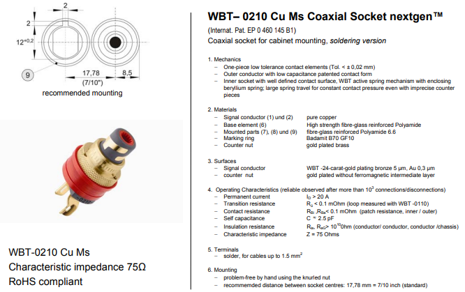 Montage-isolatoren worden geleverd en zorgen niet alleen voor isolatie, maar ook voor twistbestendige montage en polariteitsidentificatie. Tegenmoeren en dubbele stap sluitringen met lip worden ook geleverd. De moer van WBT-0210 Ag Ms is gemaakt van messing met een vergulde afwerking.